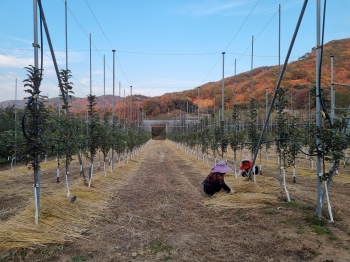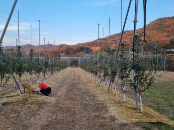 오늘은 잠깐의 틈을타 사과밭에 볏짚을 깔아 주었어요. 해마다 남편은 고집스럽게도 이 일을 꼭 해주고 있습니다. 볏 짚이 퇴비가 되어 사과가 맛나고 건강하게 자랄수 있다합니다. 그런 남편의 마음을 알기에 이런 힘든 일에도 참 정성을 쏟는 언니들입니다. 언니들 손은 때론 이렇게 예술작품을 만들곤하지요^^